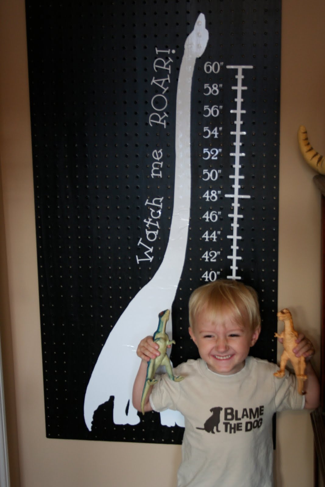 Welcome to the chalkboard paint party!  I have to admit that I procrastinated on my chalkboard project and then it ended up not going so well.  I had to quickly come up with a Plan B, and here it is!  I had an old pegboard in the basement which wasn’t being used and a vinyl I won as a giveaway…almost a year ago…which needed to be used!  I slapped some chalkboard paint on my pegboard, rubbed the vinyl on top, and now have a cute growth chart for my boys.