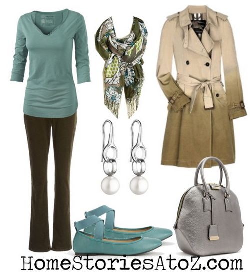 The color palette in this soothing kitchen is beautifully simple as is my outfit design. At this point in the game, I am guessing that you can easily spot the inspiration for my shirt, pants, and shoes, but how about the rest of the outfit? The trench coat was inspired by the gorgeous “dip-dyed” appearing urn. My earrings were chosen based on the chrome and white pendant lights. The scarf was inspired by the greenery and the blue utensil jars and the purse was actually inspired by the antique metal scoops hanging on the island. Every detail in one design can inspire every detail in another!
