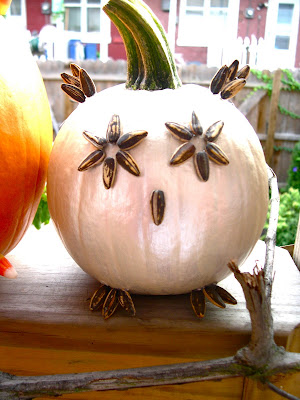 Apparently our owl pumpkin was expecting :).  My five year old went to the pumpkin patch yesterday and brought home another little pumpkin that he insisted on decorating immediately.  While standing in line at the grocery store, I was flipping through a Family Circle magazine and saw a similar idea to my candy corn pumpkin!  They used white pumpkins and sunflower seeds to create the look.  I loved the idea of a white pumpkin so we painted the little guy and hot glued on some sunflower seeds.  So simple and so cute.  Now my boys want a Daddy and another baby to complete the family.  We’ll see…