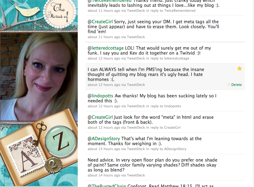 Ohhh and as I look at your picture again, I see that the very botton tweet was to me… in response to my recent PMS whiny tweet! Ugh!! Told you I do it!