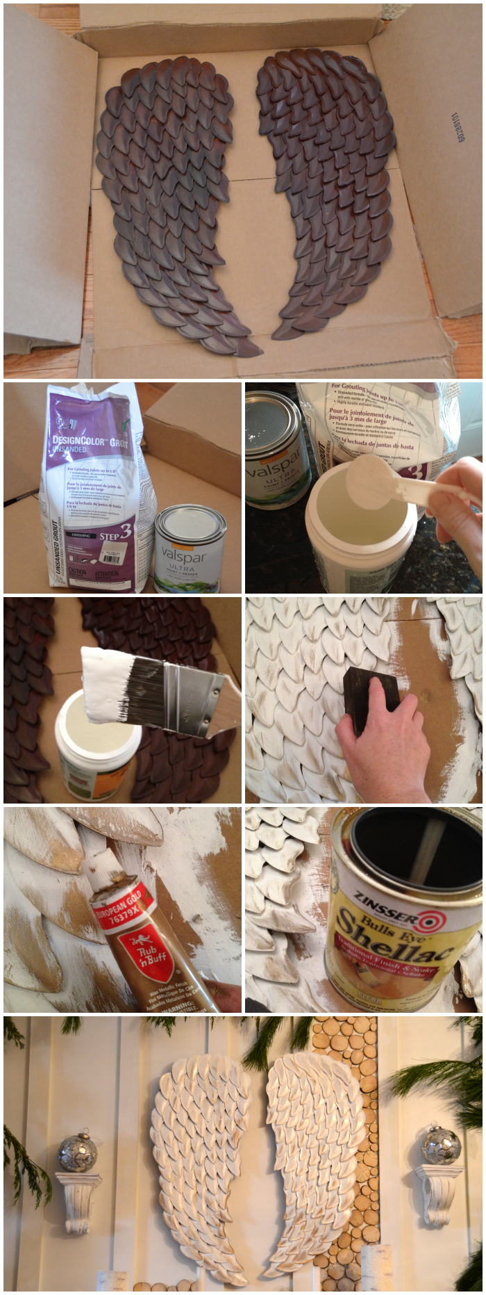 I knew that I wanted angel wings above my mantel this year. I had originally planned on making some by using cardboard for the base of the wings and cutting feathers from cereal boxes. But when I stumbled on these angel wings at Marshall’s for $14.99, I figured I’d save myself 15 hours of work and just paint them!