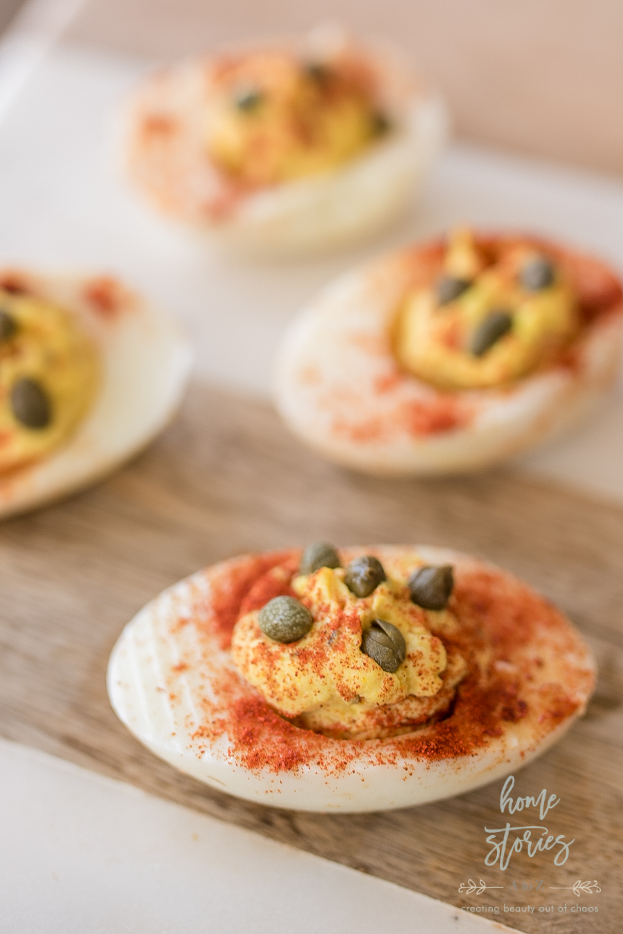 The capers add the perfect amount of saltiness to the hard boiled eggs. You can also add some crumbled bacon to the top of each if you like your eggs extra decadent! I skipped the bacon this time and just stuck with the capers and smoked paprika.
